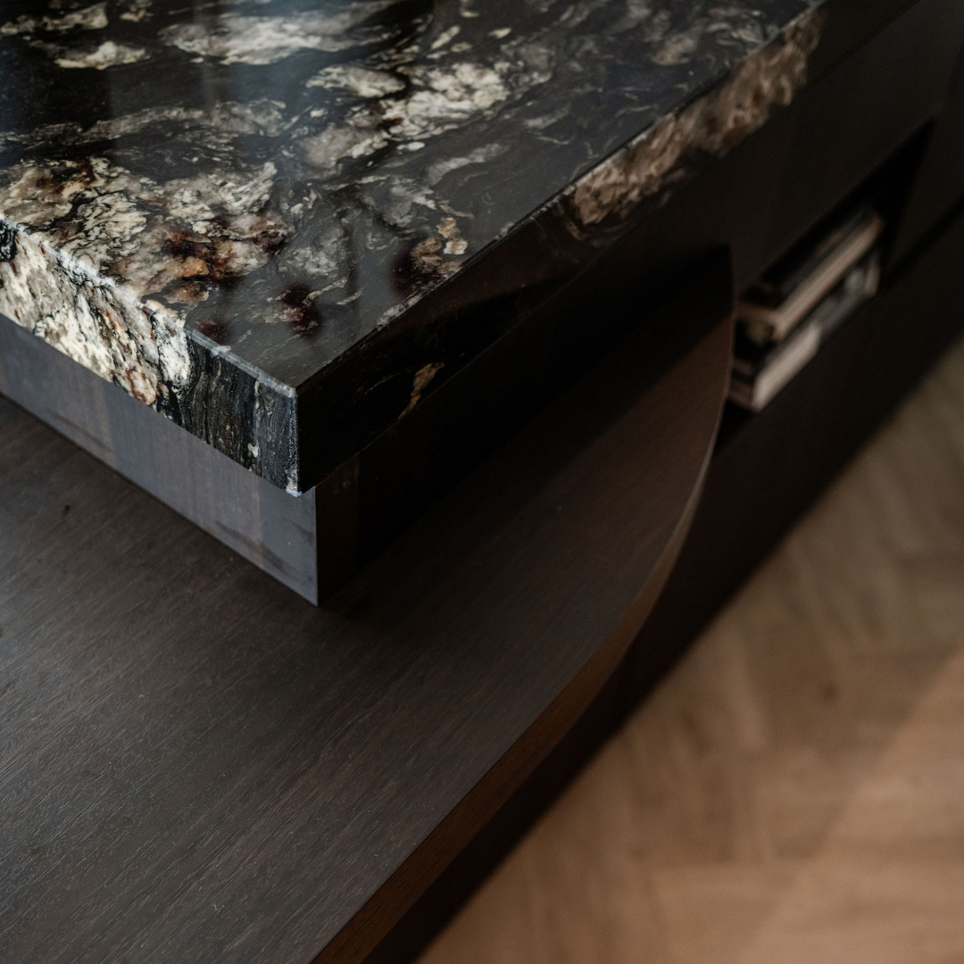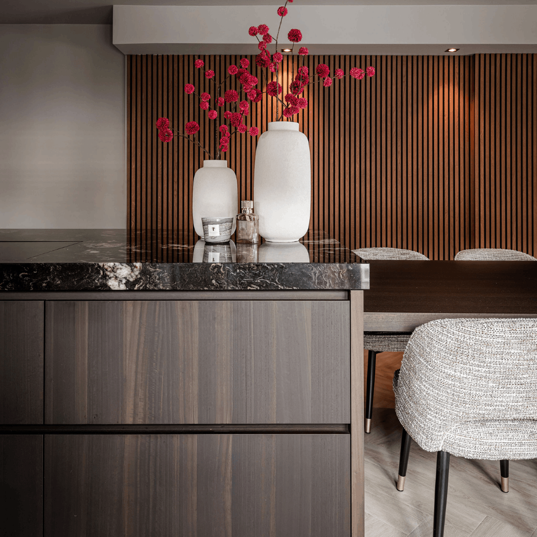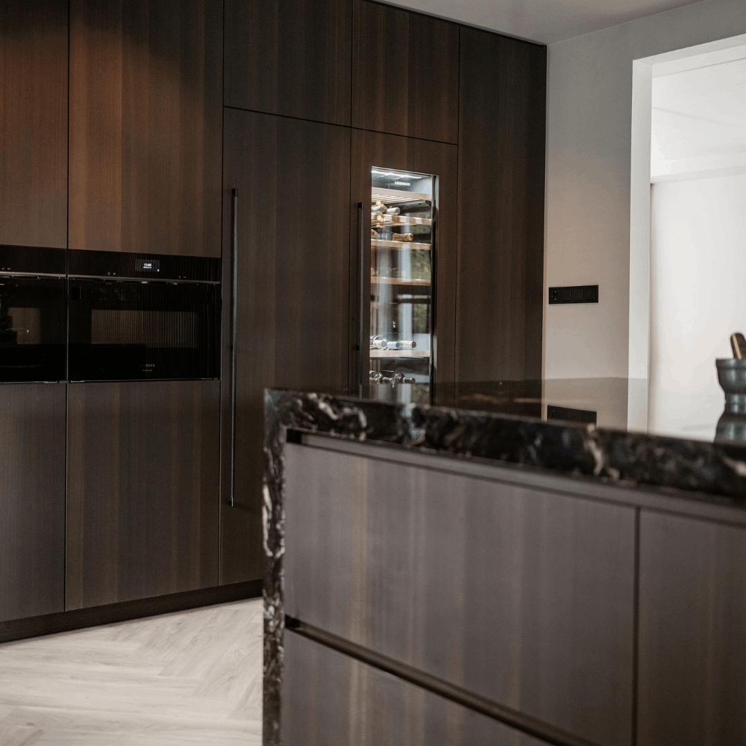 De keuken is uitgevoerd in eucalyptus fineer, gebeitst op kleur, in combinatie met exclusief Belvedere natuursteen. Een warme en luxe materiaalcombinatie met veel diepte en karakter.
