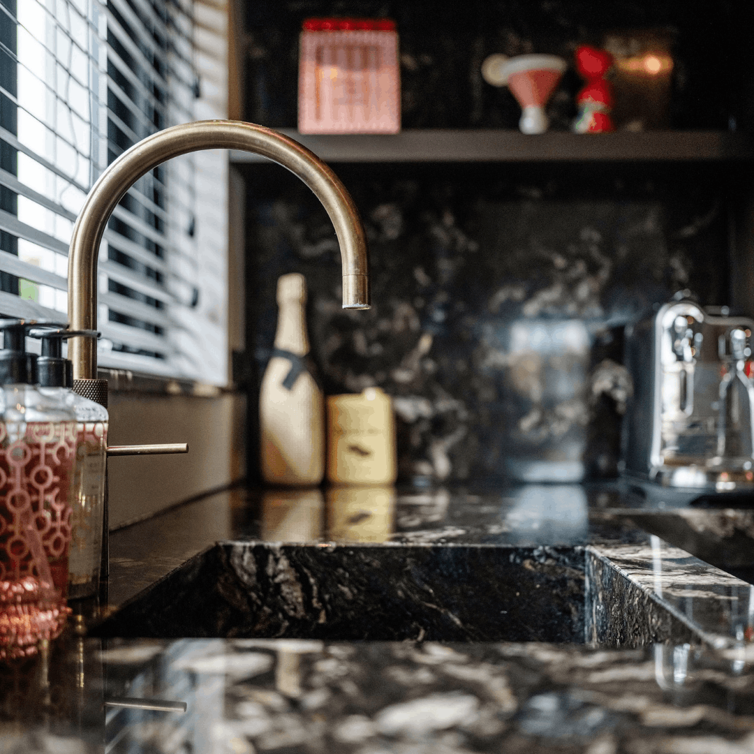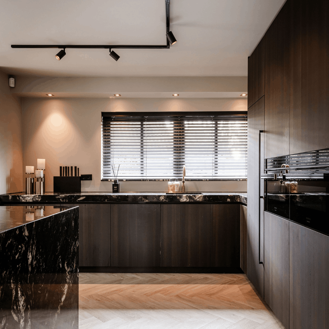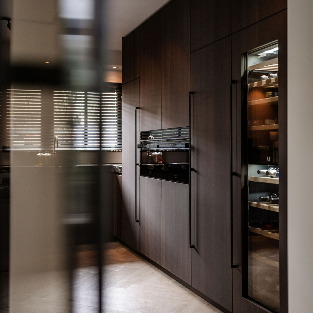 De keuken is voorzien van een Quooker in messing patina, Siemens Studioline apparatuur en een Liebherr wijnkast. Functioneel, stijlvol en tot in detail afgestemd op het ontwerp.
